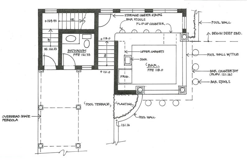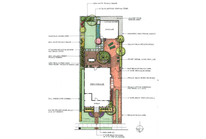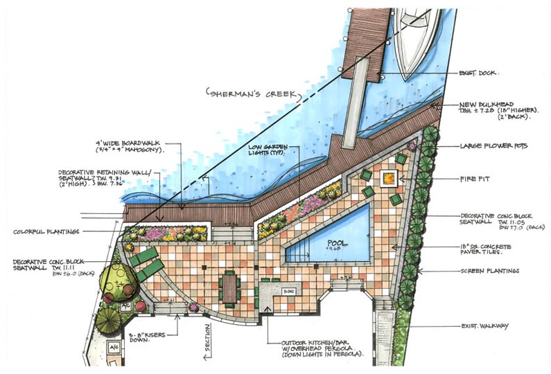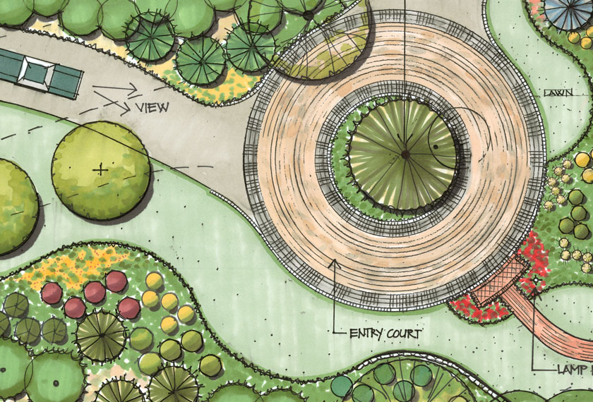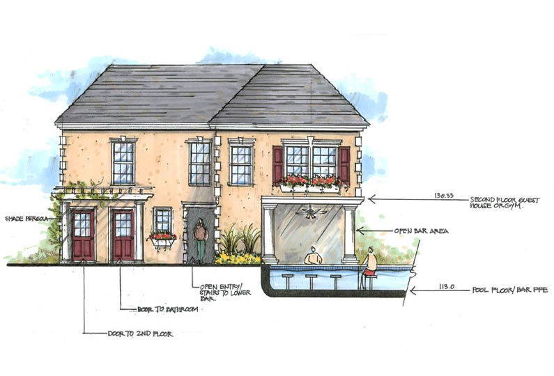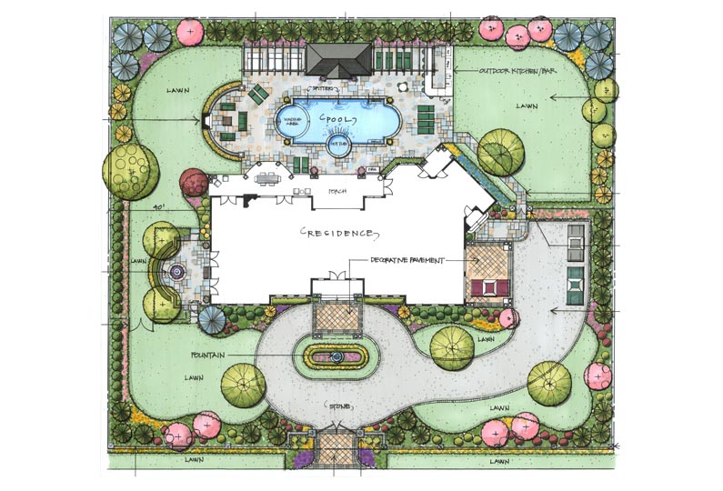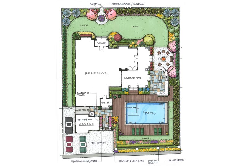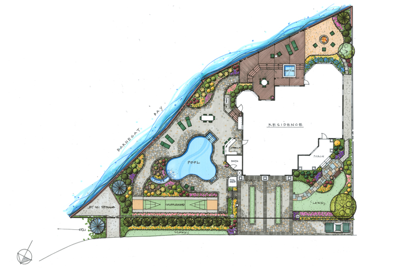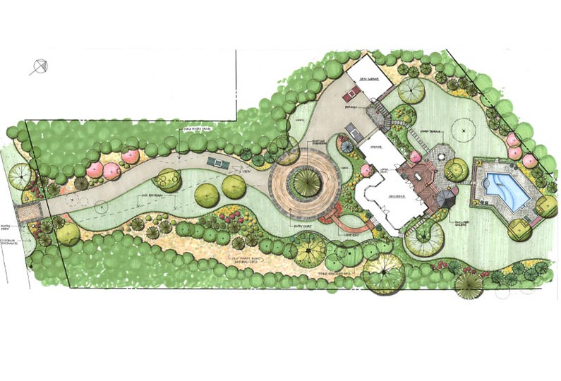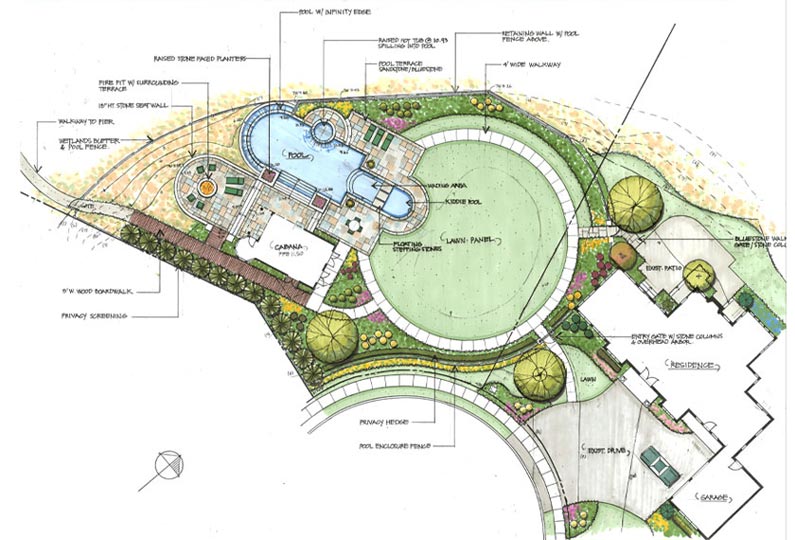 This color rendered Conceptual Masterplan serves as a framework for the property and the design can be implemented in phases if desired. A plan is important for clients who wish to ‘do it right from the start’ so costly mistakes are avoided. With real estate costs at a premium, it’s also important to have a plan that maximizes the property to its fullest potential.